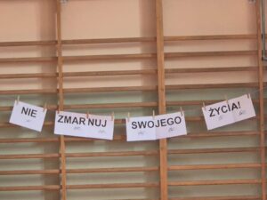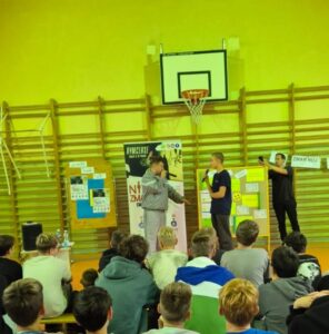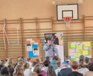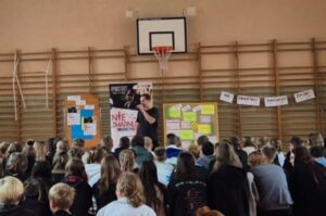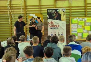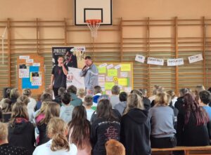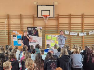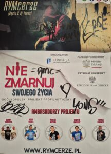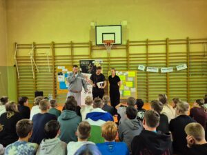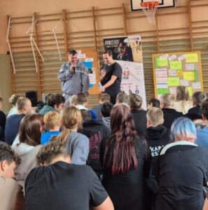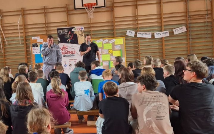 „Nie zmarnuj swojego życia”, skierowane do uczniów klas 7 i 8. Zajęcia poprowadzili Rymcerze – znany duet twórców hip-hopowych, który od lat angażuje się w działania społeczne i edukacyjne, szczególnie wśród młodzieży.