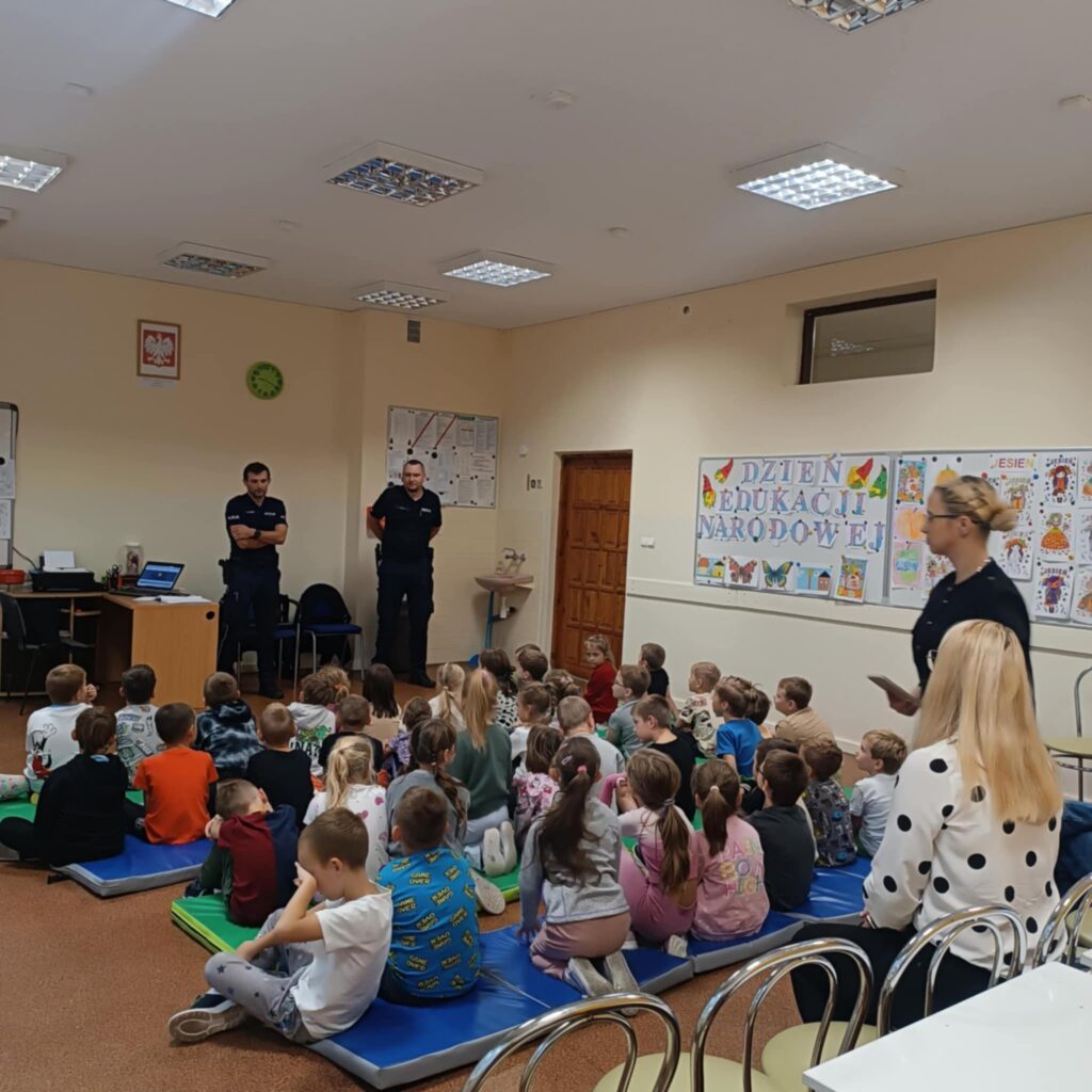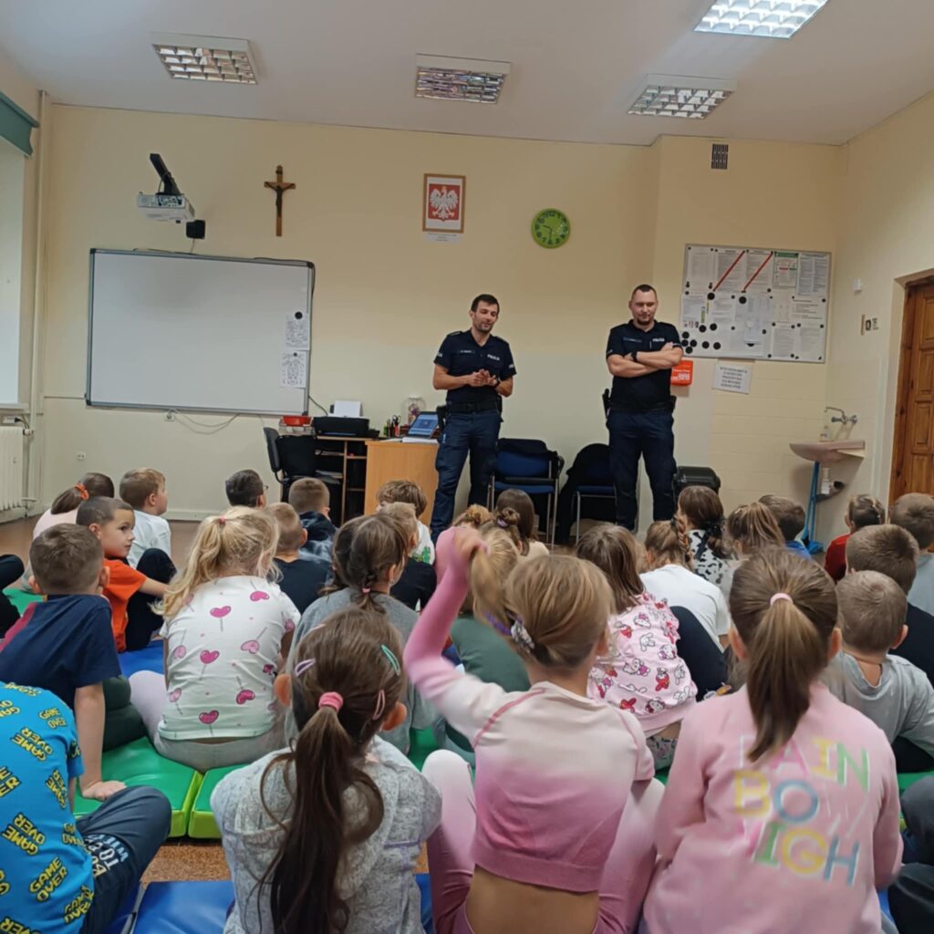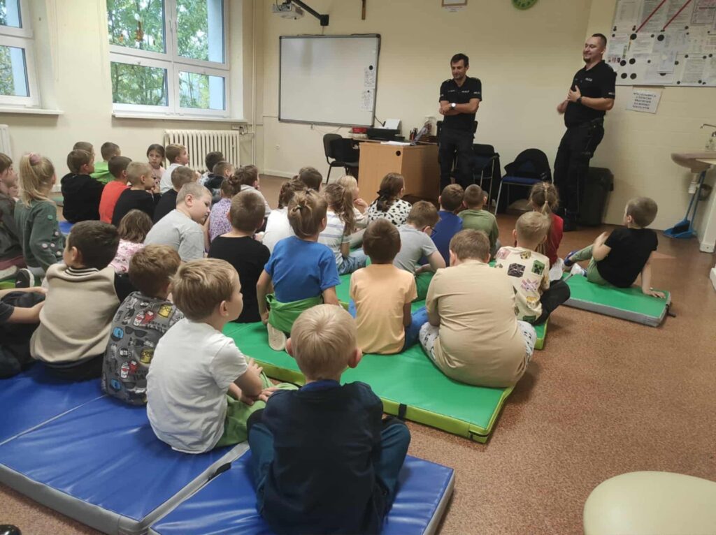 Policjanci w przystępny i ciekawy sposób przekazali dzieciom najważniejsze informacje dotyczące poruszania się po drogach. Pierwszoklasiści dowiedzieli się, jak prawidłowo przechodzić przez jezdnię, na co zwracać uwagę przy przechodzeniu przez pasy oraz dlaczego warto nosić elementy odblaskowe, zwłaszcza w sezonie jesienno-zimowym.