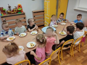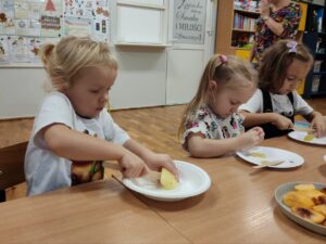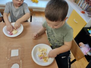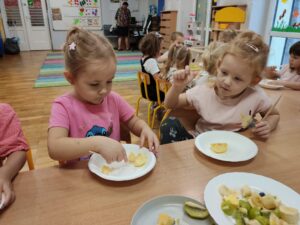 Następnie nadszedł czas na najciekawszą część – przygotowanie sałatki! Dzieci z ogromnym zaangażowaniem kroiły owoce drewnianymi nożykami, mieszały składniki w dużej misce i z dumą podziwiały efekt swojej pracy, a w sali unosił się cudowny, słodki zapach.