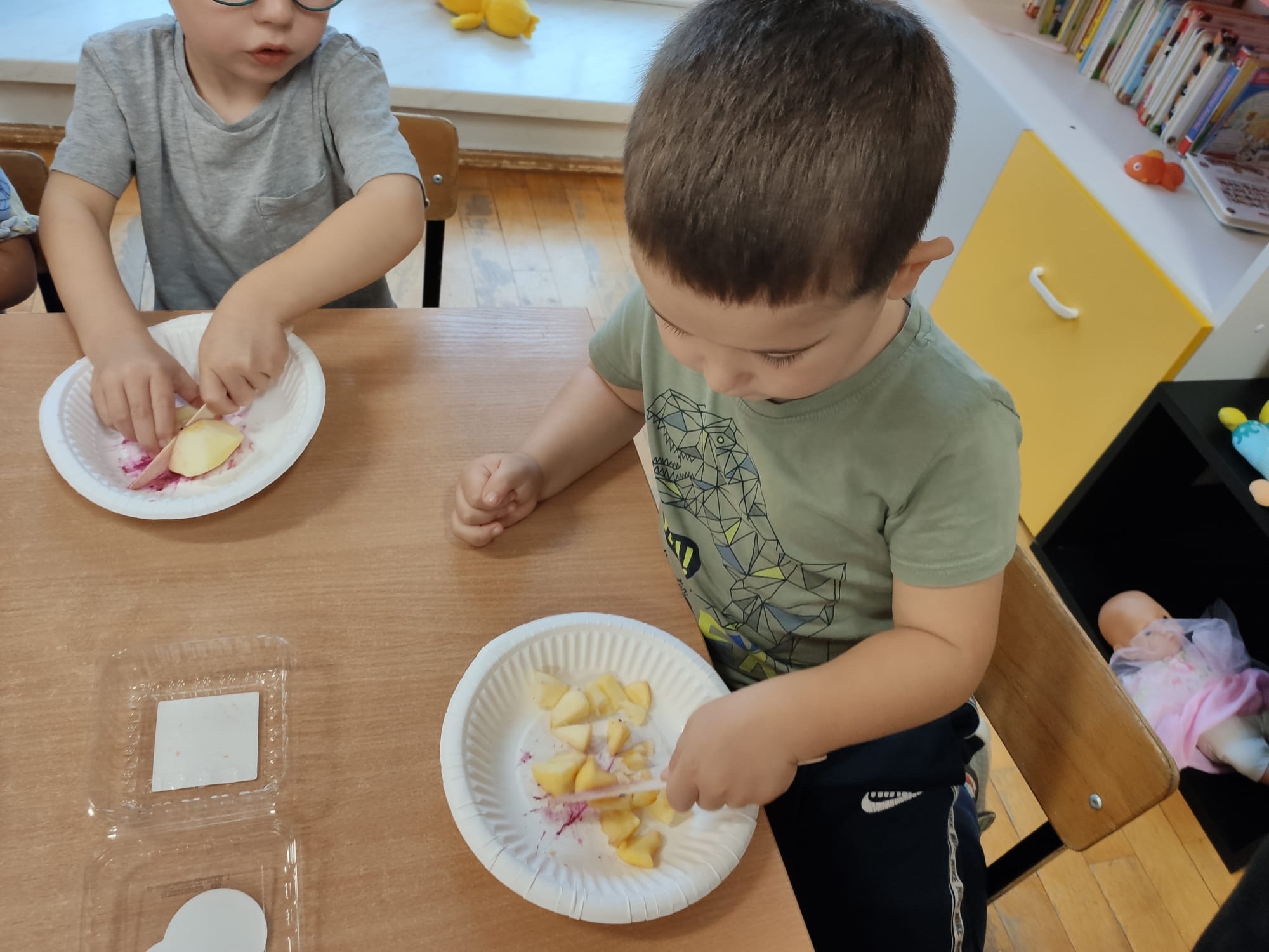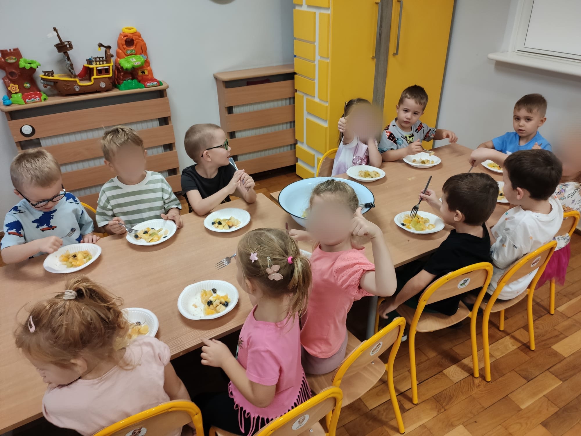 Dziś dzieci z grupy II postanowiły zamienić się w małych kucharzy i przygotować pyszną oraz zdrową sałatkę owocową.